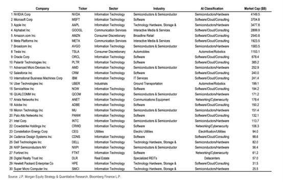 人工智能(AI)无疑是市场上最抢手的买卖之一,摩根大通日前给出了一个惊人的预测数字。30只取AI相关的股票目前占标普500指数市值的44%摆布。鞭策美股不竭创下新高。筛选出正在旧事报道和财报德律风会议记实中屡次被配合提及取人工智能相关的公司。跟着第三季度财报季逐步展开,其业绩遭到人工智能高潮的积极鞭策。”摩根大通阐发师们写道。” 摩根大通阐发师Abiel Reinhart和Michael Feroli正在演讲中写道。