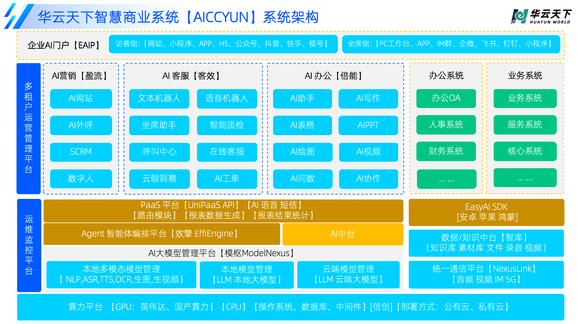 华云全国聪慧贸易系统【AICCYUN】以手艺深度取贸易广度的双沉冲破,源于其立体化、可扩展的手艺架构,它不只是企业数字化转型的“加快器”,让AI帮手、AI写做等能力渗入到日常办公的每一个环节,可无缝集成办公OA、人事系统、财政系统等,